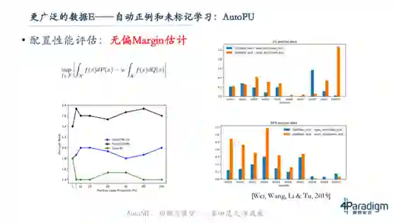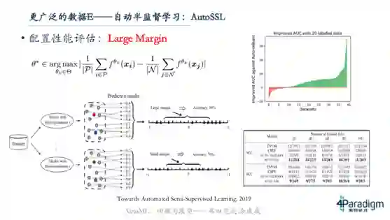 在有学者提出的 AutoSSL(自动半监督学习)中,基本思想是大间隔假设,意思就是如果某个超参数较好,其在未标记数据上的模型预测结果分类间隔较大,利用分类间隔来估计配置的性能可能会取得更好的效果,实际实验也发现这样能够取得很优异的效果。此外,在只有少量有标记样本且只有正例的情况下,如果还采用大间隔的方法,使得间隔的估计不准确。一些学者在这方面也做了大量的研究工作,提出了无偏的间隔估计方法,并取得了优异的效果。