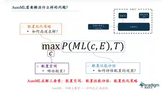 自动机器学习的定义就是试图在有限的资源限制和没有人为辅助的情况下自动找到解决目标问题的尽可能优的机器学习配置。自动机器学习求解有三个要素,第一个是机器学习到底有哪些配置,它的配置空间是什么;第二个是有了配置之后,我们如何评估配置的性能;第三个是有了配置空间定义和配置性能评估方法之后,如何高效的找到这些任务。因此,总结自动机器学习三个核心的要求,就是配置空间、配置的性能评估、配置的优化策略。
