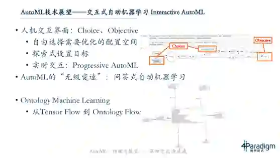 机器可以优化明确的量化目标,人可以做目标拆解,通过这种实时交互的方式,人能够获得即时的反馈,同时能够探索去设置适合最终问题的目标。同时,我们还需要新的一套描述机器学习的基础界面,在现在用诸如 Tensor 之类的浮点数矩阵来描述机器学习的基本元素,然而实际业务中很多数据并不是浮点数,诸如地址、性别、职业、类别等等,这类抽象知识描述可能更加适合的方式是 Ontology 这样的表达。基于 Ontology 的机器学习也是未来自动机器学习需要关注的。