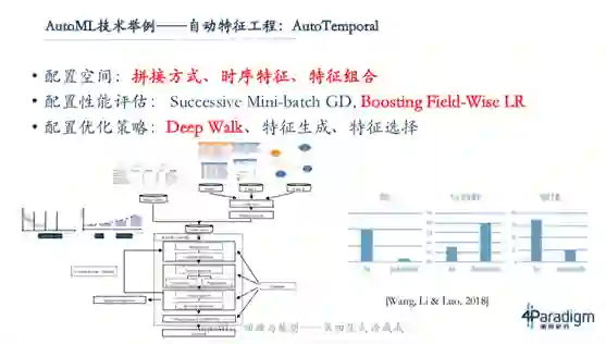 此外,在实际的业务当中,会碰到各式各样的数据,这些数据是以多张表的形式呈现的,但是机器学习算法只能接收一张表,而且实际业务会存在大量的时序特性,对自动机器学习而言,如何构建有效的时序的特征、将多表拼接成一张表的问题更为复杂,搜索空间要比自动特征组合更为巨大,第四范式有学者提出了 AutoTemporal 的方法,同样在性能评估、优化策略上进行了更加深入优化,并在实际应用中获得了很好的落地,相比专家做出的方案,利用了更少的特征,获得了更好的准确率,并在实际预测耗时上数个量级低于专家设计的方案。