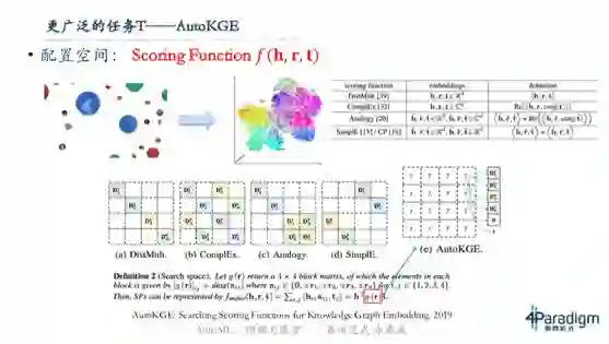 但机器学习算法只能接受向量化的表示,无法直接使用知识图谱,所以将知识图谱转化成向量化表示是关键,而知识图谱向量化表示的关键在于评分函数的设计,这些评分函数之前往往是人为根据不同的数据情况设计的。就有一些学者提出了 AutoKGE,将知识图谱的评分函数表示成 4×4 的矩阵这样一个配置空间,再经过一些巧妙的优化策略设计,获得了远超出人为设计的评分函数的效果。