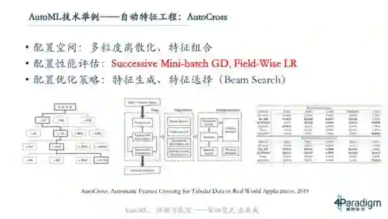 因此有学者提出了 AutoCross 方法,这类方法在搜索策略以及性能评估上做了专门的优化,比如利用 Beam Search 这样的贪心方法对特征组合空间进行探索,提出了 Successive Mini-batch GD, Field-Wise LR 可以并行的评估很多的特征组合,保证效果的同时,可以大幅提高评估效率。