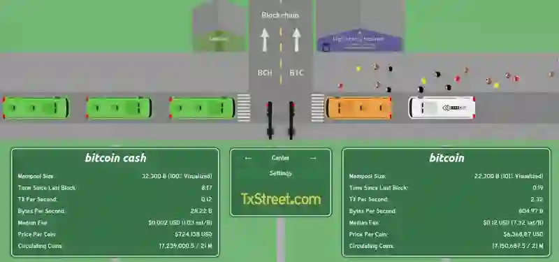 TxStreet 清晰地表明,除了在底层架构上有所类似外,BTC 和 BCH 有着越来越大的根本性差异,比如可供交易的“公交车座位”的数量。创建比特币现金分支的最初目的是为了提升交易区块的容量,因为比特币现金的拥护者认为区块容量会提升交易速度。所以,TxStreet 上比特币现金的“公交车站”有 32 辆公交车在候车,代表着每个 BCH 区块有 32 兆的交易数据空间。不是所有的公交车都每隔十分钟就前往区块链,它们是以交易量为基准的。