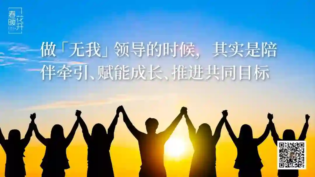 第四重境界是「无我」领导。我选择这个词是源于我们需要跟更多人合作,这个「无我」的概念就是在《道德经》当中,我们讨论的无为而治。有时候我就会跟大家说,为什么今天我们要讨论无为而治这个概念?就是你要「无我」,原因就在于真正的无为而治,是你提供机会,让所有相关者能够有所作为,让更多跟你相关的人有机会去发挥作用。这个「无我」其实才是我们所讨论的这个概念。因此,做「无我」领导的时候,其实是陪伴牵引、赋能成长、推进共同目标。
