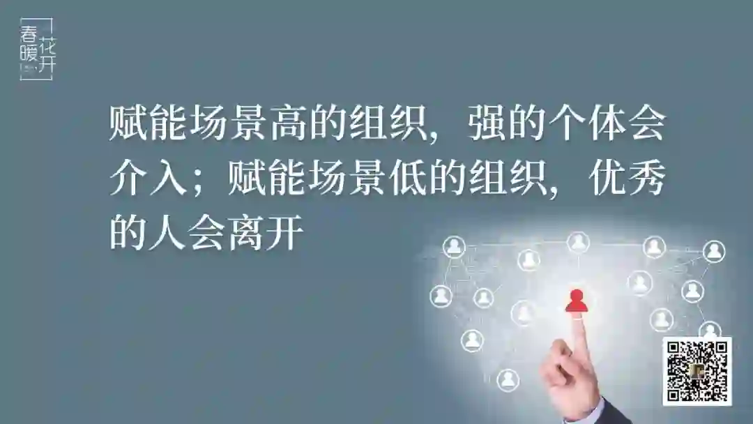 什么样的优秀人才和什么样的人能够在组织内部不断提升起来?某种程度上我们用了一个词叫「赋能场景高的组织」,我们会看到强个体的介入。赋能场景低的组织,我们会看到优秀的人离开。所以我们在今天的整个组织管理当中,我们第一个改变的关键词就是由我们讲的管控转向赋能。