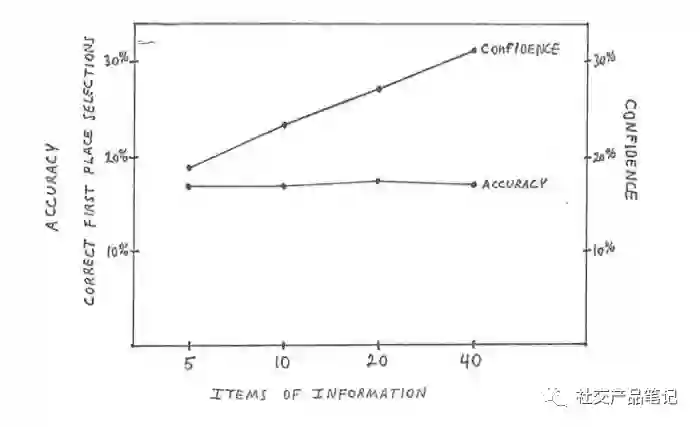随着更多的信息被添加进来,这项研究的关键部分出现了;每个赛马手被允许挑选越来越多的数据,当他们这样做的时候,他们对自己预测的信心增加了,而他们的实际结果却大致保持不变。