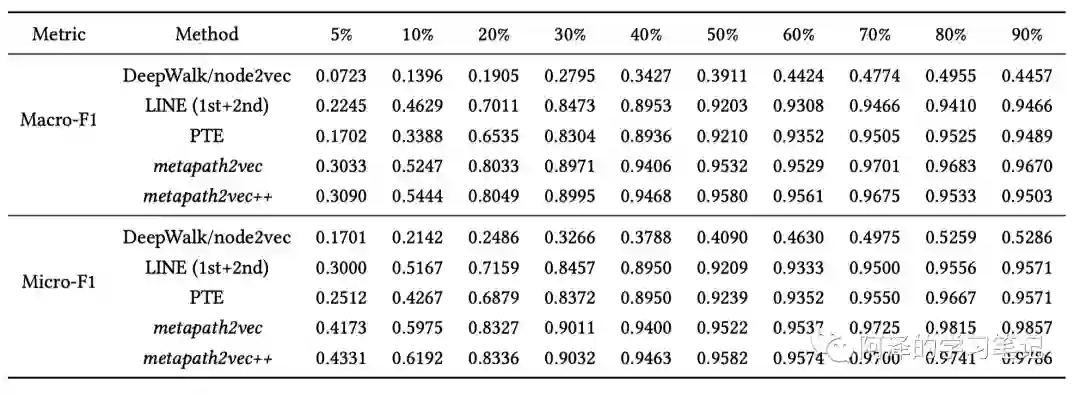 以 Aminer 数据集为例,“会议”节点节点分类的结果:(百分号为训练的数据集的占比)