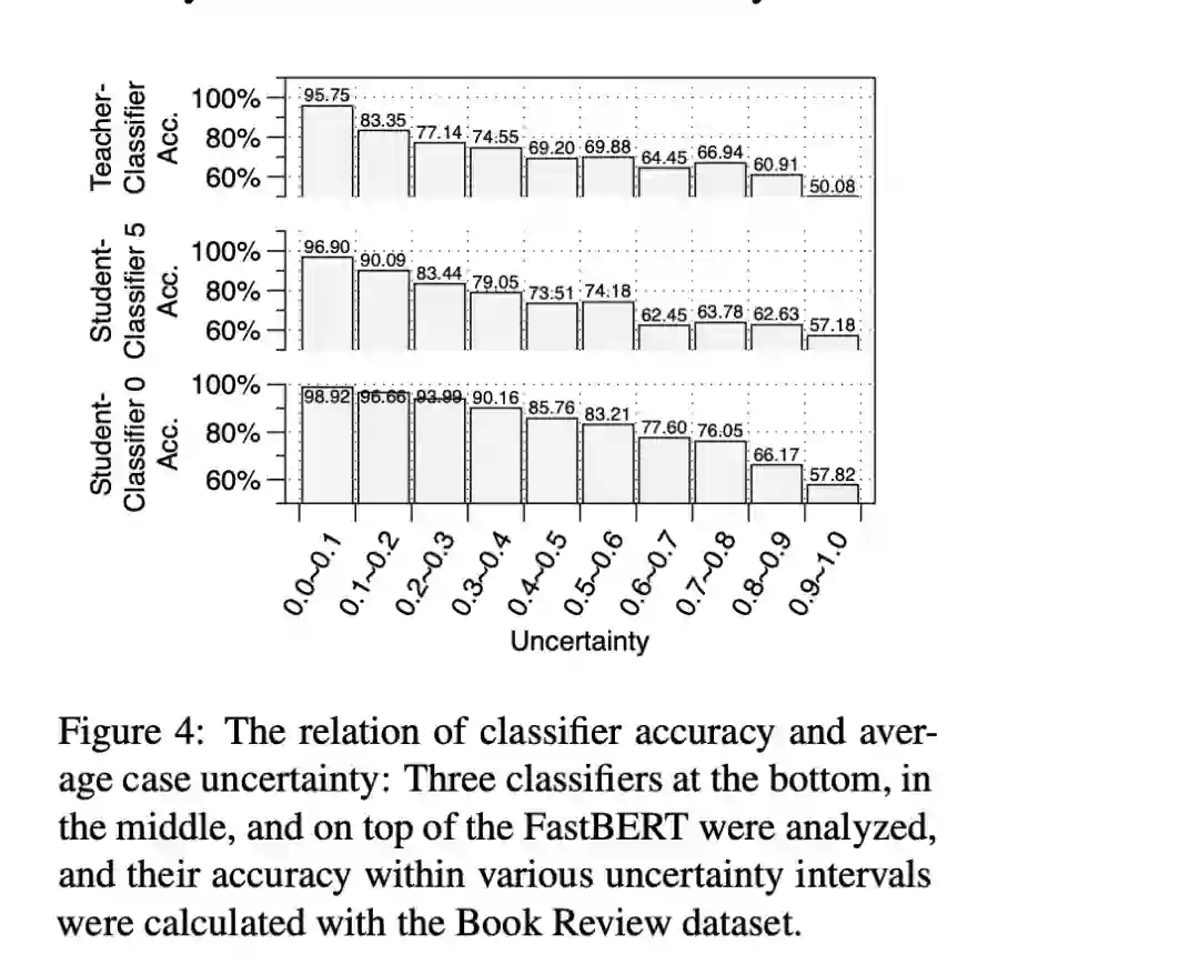 作者分析了一个 FastBert 模型的三层:Student-Classifier0, StudentClassifier5, Teacher-Classifier 的分类结果,并在不同的不确定度区间评判分类准确度。