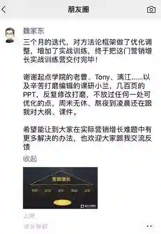 为了帮助大家更好的理解和掌握营销的用户、渠道、传播整合策略,解决用户拉新、留存、收入转化等增长问题,推荐由起点学院联合美图秀秀副总裁@陈辉老师、《极限挑战3》宣传顾问@魏家东老师,共同打磨迭代的【营销增长实战训练营】