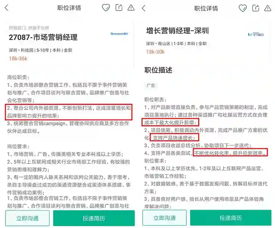 一方面,营销市场人开始要背转化、背业务指标,比如这些互联网大厂的营销类岗位,对转化增长越来越关注。