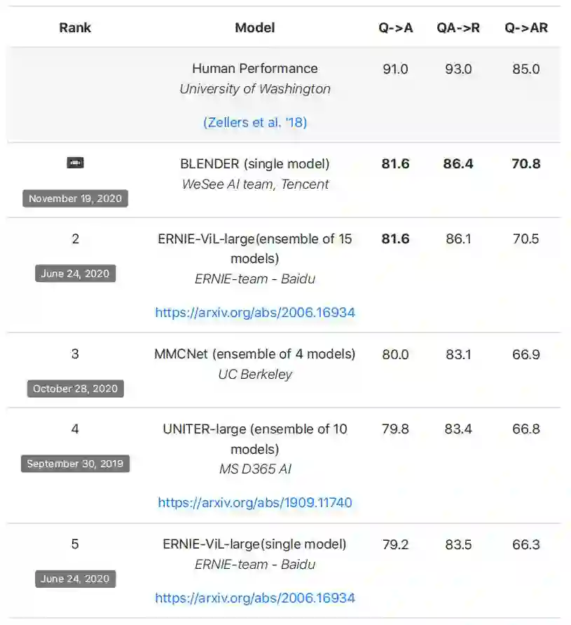 2020 年 11 月 19 日,腾讯微视「BLENDer」模型凭借「81.6,86.4,70.8」的成绩,登上了多模态领域权威榜单 VCR 的榜首。