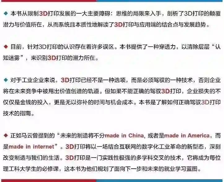 所以,无论你是学校里的学生,无论你是否在学习3D打印相关的知识,无论你是制造业的管理层还是技术人员,无论你的企业是否已经使用了3D打印技术。这本《3D打印与工业制造》都将为你揭开3D打印关于价值创造的奥秘,让你从应用的角度上理解3D打印的价值,不仅对3D打印的发展建立全局感,还能敏锐地捕捉到3D打印与应用端结合的落脚点。然后有针对性地去补充自己需要的知识,包括材料、机械、软件、检测、后处理、激光加工等,你将从中受益。