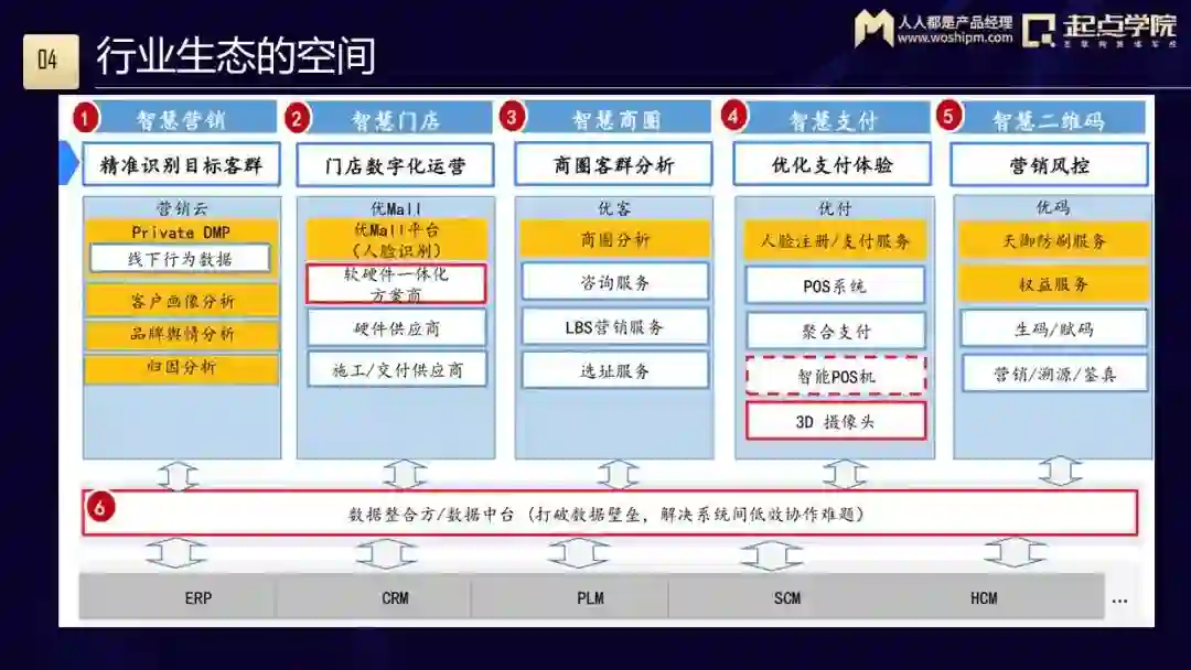 以商超为例,这张图中黄色的部分是T厂目前自身有的能力,蓝色的部分是自身没有并且需要依赖其他合作伙伴一起提供的能力,红色的部分是未来准备投资一些区域和产业: