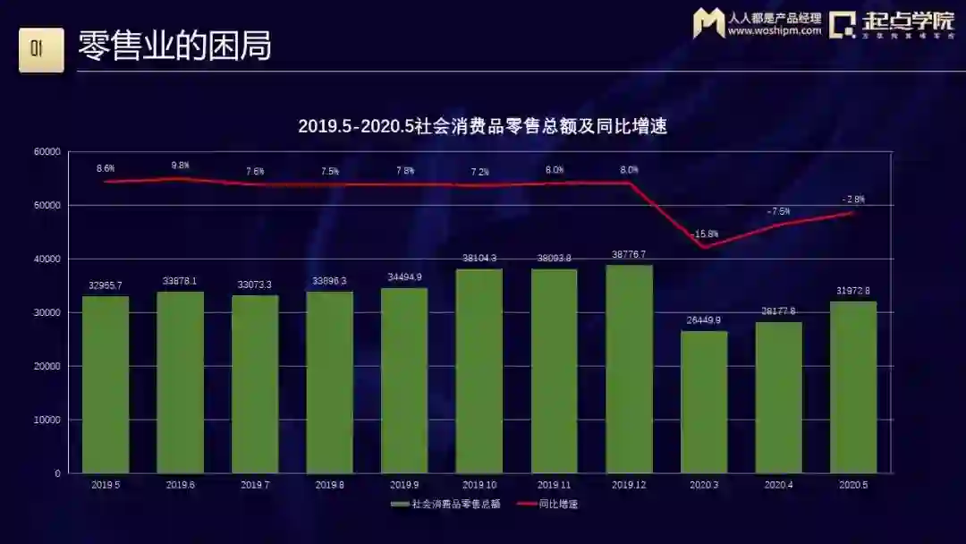 中国的社会品消费总额增速连年下降,这给零售业带来了很大的压力。零售业在线上的比例是连年递增的,这就意味着线下零售的空间被进一步压缩——特别是在疫情期间,3月份零售业总额同比下降了大概16个百分点。