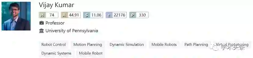 VijayKumar获得俄亥俄州立大学机械工程博士学位后。他在1998-2004年间负责指导宾夕法尼亚大学的GRASP实验室,进行交叉学科的机器人及认知研究。目前,他的研究兴趣主要集中于多机器人系统和微型飞行器,最著名的研究成果在多机器人编队的控制和协调方面。