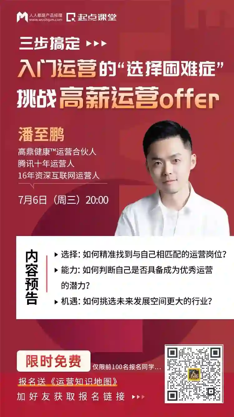 然后,关于运营入门难不难、不清楚往哪个运营岗发展、不知道如何准备求职面试等问题,我们邀请到了前腾讯高级运营经理@潘至鹏老师,为我们开展一期直播课,本周三晚将会为我们进行详细讲解。