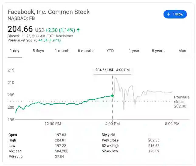 无论如何,这笔罚款似乎给 Facebook 带来了一些好的外界预期——它的股价先是随着 FTC 消息的公布而略有下滑,但在下午就开始回升,最终报收于 1.14% 的增长率。