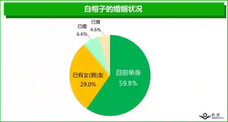 或许是因为挖洞的成就感远远超过了异性的吸引力,白帽子群体堪称单身狗俱乐部。接近60%的白帽子目前还是单身状态;虽然也有近三成的白帽子已经有了自己的女(男)朋友,但真正已婚、已育的白帽子仅有10%多一点。