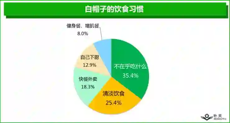对于饮食,白帽子普遍不怎么挑剔:从来不在乎吃什么的白帽子超过35%,喜欢清淡饮食和快餐外卖的白帽子也分别多达25.4%和18.3%。真正能够自己下厨做饭,保持健康饮食的白帽子,仅有20%多一点。