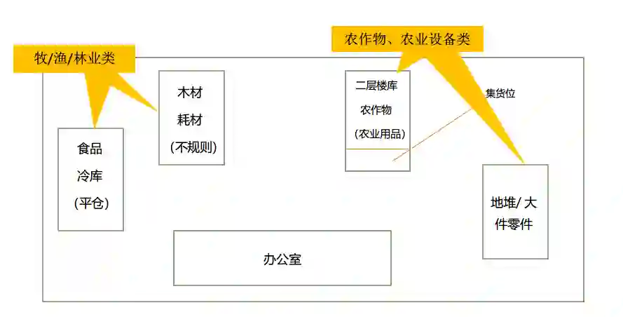 以村社为单位建立集中物理仓库,不同品类进行不同库区及库位存放;