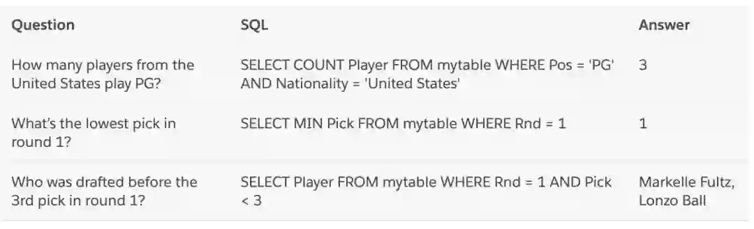 WikiSQL 包括一个由 87,726 个手工注释的 SQL 查询和自然语言问题对组成的语料库,由 Salesforce Research 发布。这些 SQL 查询被进一步分成训练(61297个例子)、开发(9145个例子)和测试集(17284个例子)。它可用于与关系型数据库有关的自然语言推理任务。
