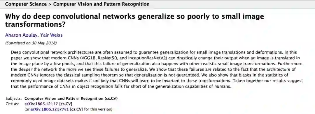 编者按:今天论智给大家带来的论文是希伯来大学的Aharon Azulay和Yair Weiss近期发表的Why do deep convolutional networks generalize so poorly to small image transformations? 这篇文章发现当小尺寸图像发生平移后,CNN会出现识别错误的现象,而且这一现象是普遍的。