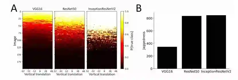 论文作者在这里引入了一种名为jaggedness的量化标准:模型预测准确率top-5类别中的图像,经历一次一像素平移就导致分类错误(也可以是准确率低一下子变成准确率高)。他们发现平移会大幅影响输出的图片占比28%。而如图B所示,相对于VGG16,ResNet50和InceptionResNetV2因为网络更深,它们的“jaggedness”水平更高。