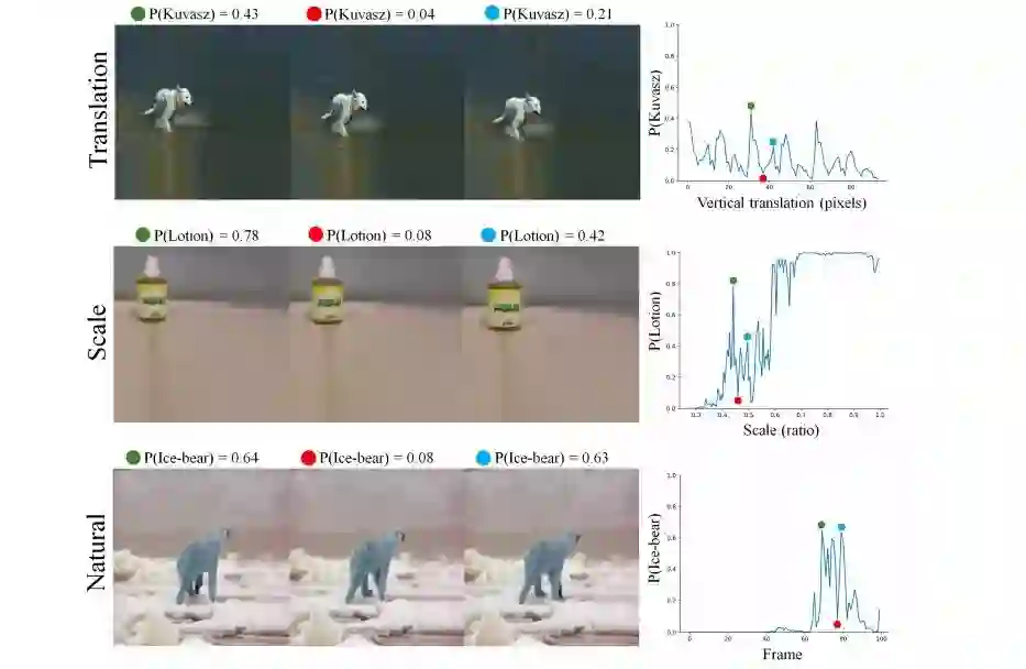 在上图中,左侧图像是模型的输入,右侧折线图是模型评分,使用的模型是InceptionResNet-V2 CNN。可以发现,作者在这里分别对图像做了平移、放大和微小形变。在最上方的输入中,他们只是将图像从左到右依次下移了一像素,就使模型评分出现了剧烈的波动;在中间的输入中,图像被依次放大,模型的评分也经历了直线下降和直线上升;而对于最下方的输入,这三张图是从BBC纪录片中选取的连续帧,它们在人类眼中是北极熊的自然运动姿态,但在CNN“眼中”却很不一样,模型评分同样遭遇“滑铁卢”。