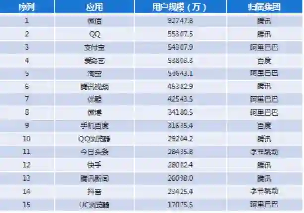 市场头部媒体竞争格局初步明朗,媒体资源集中于头部媒体,从2018年12月全网月活跃用户规模TOP 15可以发现,流量主要集中在腾讯、阿里巴巴、百度手中。
