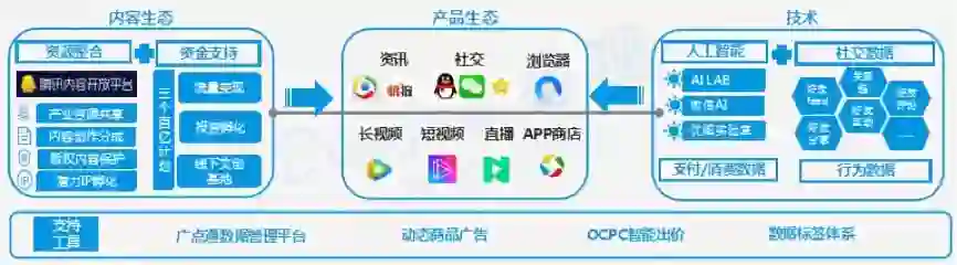 流量整合:腾讯已经调整公司整体的内容和广告体系,OMG的效果广告划到了广点通。腾讯内容开放平台主载体的“企鹅号”,已经完成了对腾讯内部内容、流量的整合,——企鹅号的内容接入后将分发到微信、QQ、QQ浏览器、腾讯视频、QQ空间、腾讯新闻、天天快报及应用宝这八大平台。