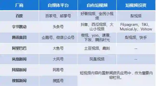 在内容方面,头部厂商均在加大投入,提升内容质量,丰富内容展现形式,其中大型互联网厂商均将短视频内容嵌入资讯产品,领先厂商在此基础上则通过内部孵化+外部收购方式占领短视频市场。