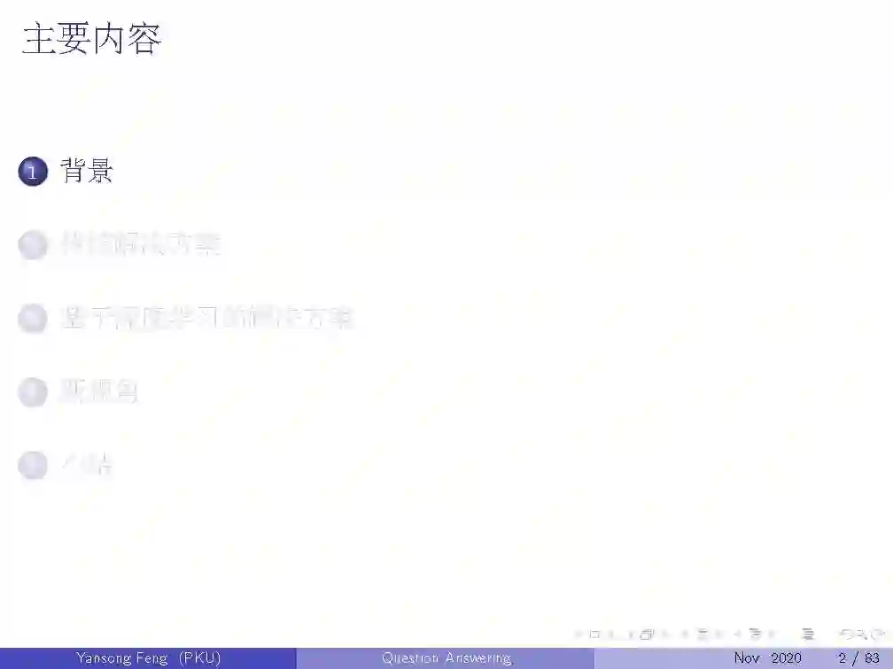 自然语言问答是支撑智能人机交互应用的核心技术,受到学术界和工业界的广泛关注。其中,基于大规模结构化和非结构化知识资源的智能问答更是近些年来的研究热点。本报告将首先梳理自然语言问答的发展脉络和基本概念;进而从基础技术框架、知识资源类型以及复杂问题解析等几个方面介绍近年来知识问答方向的研究进展;最后,将结合目前研究工作中仍存在的挑战与大家分享对未来研究的一些看法。