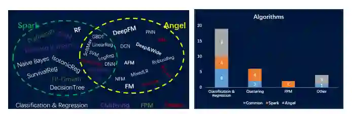 从图7中可以看出,Spark On Angel中的算法与Spark中的算法存在显著的不同,如:基于Spark On Angel的算法主要是针对推荐和图领域,然而Spark中的算法更通用。