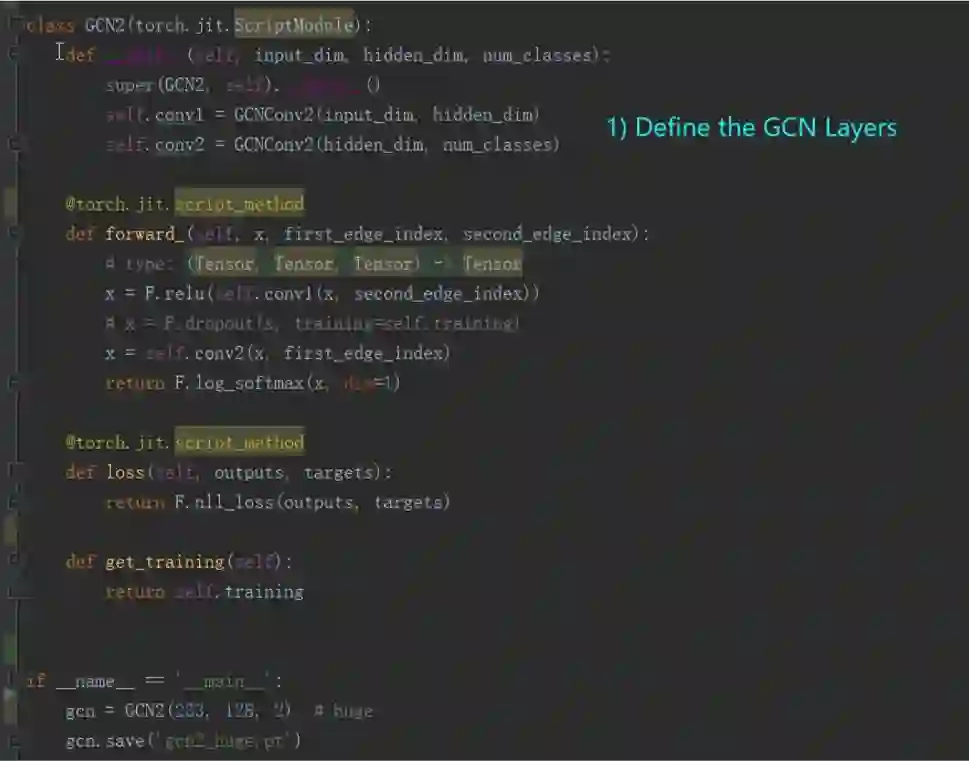 当然,这些细节都是封装好的,算法开发人员和用户并不需要了解。在PyTorch On Angel平台上开发新算法,只需要关注算法逻辑即可,与开发单机的PyTorch算法并没有太大区别。下面给出一个2层GCN算法的实现例子: