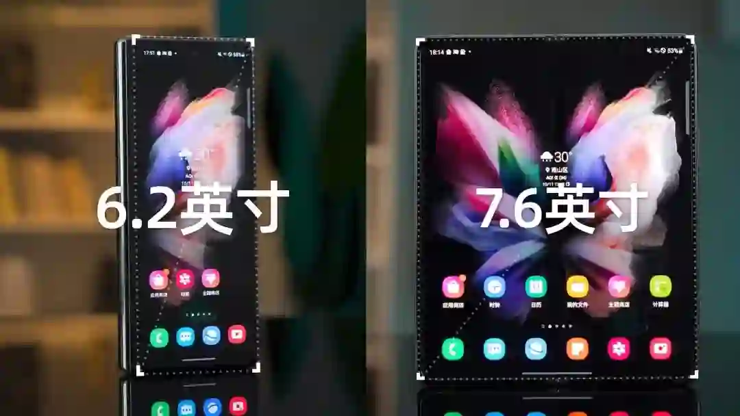 上面也提到了,今年在尺寸上没有变化,依旧是 6.2 英寸外屏和 7.6 英寸内屏组合。不过有一个升级点,展开手机的一瞬间你就能感觉出来,就是里面实实在在是一整块大屏幕,内屏前置摄像头采用了屏下处理的设计,三星管这个叫 UDC,就是 Under Display Camera。除了把内屏升级为真·全面屏之外,还把外屏从以往的 Super AMOLED 屏幕升级为了第二代 Dynamic AMOLED 屏幕,也就是说内外全都支持 10-120Hz 可变刷新率了,没有了内外刷新率不一致带来的那种卡卡的割裂感。