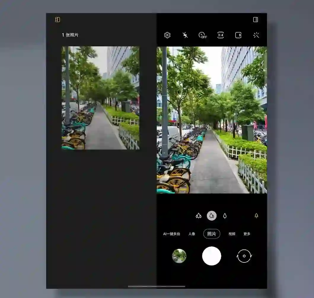 拍照的体验上也为大屏幕做了特殊的优化,在内屏模式下,如果你不想对着一整个屏幕的取景框,你可有打卡侧边预览的选项,这样无论你横屏还是竖屏,都会有一部分留出来作为本次拍摄的预览相册。还有使用外屏和后置摄像头自拍,以及在使用内屏拍照的同时,打开外屏的预览模式。