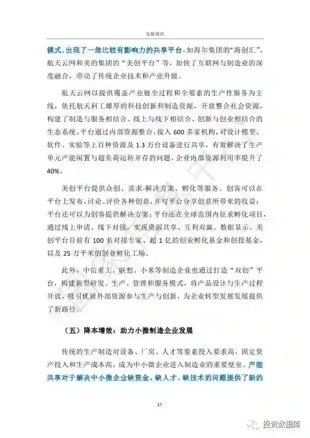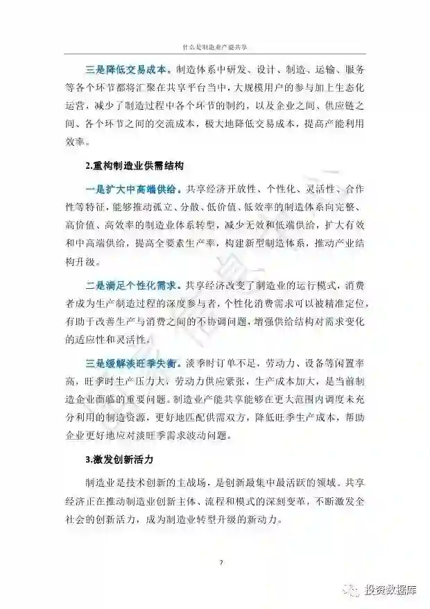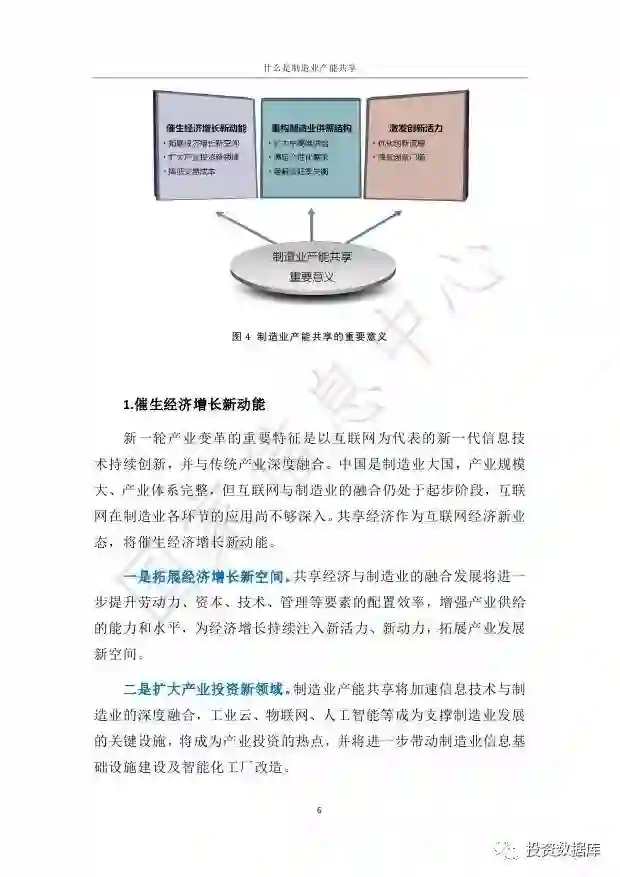 制造业产能共享主要是指以互联网平台为基础,以使用权共享为特征,围绕制造过程各个环节,整合和配置分散的制造资源和制造能力,最大化提升制造业生产效率的新型经济形态。从共享内容看,制造业产能共享主要包括设备、技术服务、生产能力和综合性服务的共享。发展制造业产能共享,能够催生中国经济增长新动能、重构供需结构、激发创新活力。