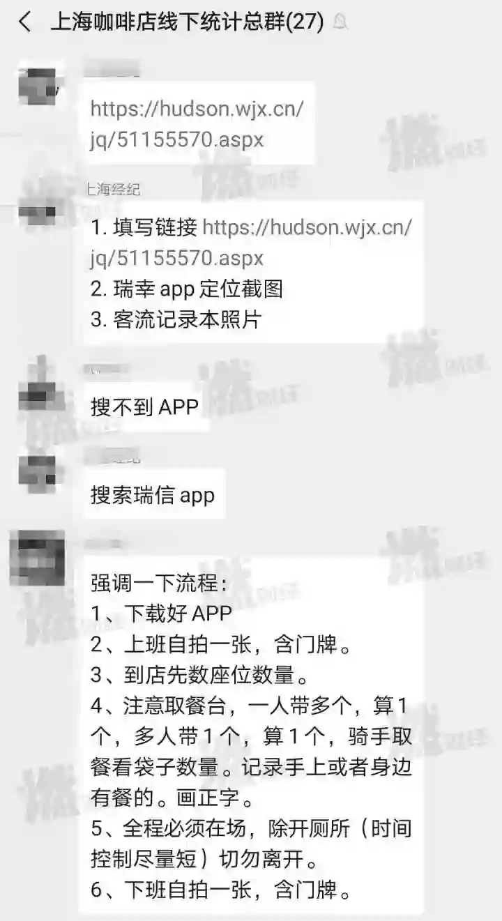 Anne 参与实地蹲点的实习生 去年12月的一天,我在一个兼职群看到了“咖啡厅统计人员”的招聘通知,工作时间是7:00到22:00,一人一天200元。入职后我才知道,我们是要去瑞幸咖啡的门店蹲点,调查瑞幸的订单量和客流量。负责管理我们的,是招聘我们的当地领队,但领队背后的甲方,应该是汇生咨询,因为工作群中有汇生的人,他们会监督领队的工作。但汇生一直没有出面,这次调查外包给上海专门招兼职的团队,相当于包工头,和兼职者直接接触的是领队,电话语音培训、人员分配、工资发放、甚至最后的数据核对,都是领队在做。当时应聘几乎是零门槛,没有任何要求,所以我去了之后发现兼职者从未成年到中年,各个年龄段的人都有,年纪最小的只有16岁。我们的任务,是在店里记录订单量和客流量。当时一起入职的兼职,第一批有四五十人,一个店派一个人,上海地区一共88家店,我一共调查了两家店。如果这个调查员记录的数据不完整或者被查出来人不在店内,就会招聘新的人员在别的日期再对这家店进行统计。按照要求,一人拿多杯算一杯,多人拿一杯算一杯,一个外卖袋子算一杯,但是兼职有很多按照自己方法来算的,比如听来单的声音统计。现场记录主要分两种,一种是在纸上画正,一种是用手机计数器。现场基本没有出现兼职被赶出去的情况,但有的纯外带和外送的店,没有座位,兼职会在外面站一天。暗访瑞幸咖啡店实习生微信群截图 受访者供图但是我们的兼职不包括录视频,因为瑞幸咖啡店没有充电口,一个充电宝也不足以录十二个小时视频。兼职上岗后的第二天,汇生方面派了员工到店里抽查兼职的情况,发现了一大批渎职的兼职,领队赶紧到没有甲方(汇生)的群里监督兼职,并对第一批被查出来兼职不在岗的店的数据进行返工重做。本来去年12月2日、3日、7日三天就能搞定所有店,最后到12月19日还有几个店没做完。我们的工资是领队核对数据过后才发。核对过后,又过了大概十来天才发,对方给出的理由是公司要财务审批。这种社会兼职一般是隔天结工资,结果这次隔了十来天。这次的领队,要负责的事情很多,其中还有核对业务。兼职需要每个小时把数据填进问卷里,数据导出来就有十二个小时的数据,由于很多兼职填错,给领队增添了非常多工作量。从调查的过程来看,我觉得领队是不太专业的,毕竟他们只是做具体的执行。作为甲方的咨询公司人手有限,要调查那么多店,也只能外包给当地领队了。但最后出来的做空报告,确实还是非常专业的。其实很难得看到咨询公司做项目是找上包工头、零门槛招社会兼职的。一般的咨询公司都是招在校生做PTA(兼职项目助理),厉害的咨询公司的PTA,不给工资都有人抢着干。去年11月25日,汇生还在招PTA做瑞幸项目,后面发现人手不够,只能开始招兼职。*应受访者要求,Miky、Aaron、Eason、Sam、Anne均为化名。