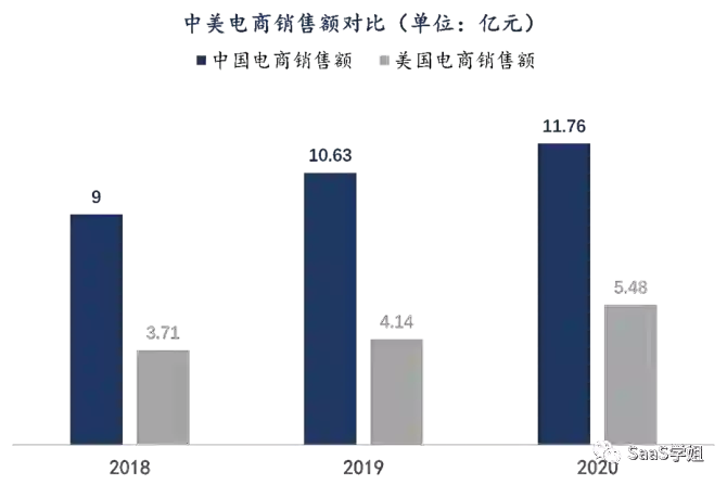 虽然美国互联网起步更早,但得益于中国人口和购买力的双引擎,电商行业的销售额一直远超美国,成为移动互联网时代最耀眼的那颗星。