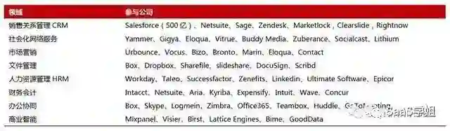 其中,Salesforce 市值超过1440亿美元,Workday 的市值超过380亿美元。同时,在未上市公司中,也不乏估值超过10 亿美元的SaaS 独角兽公司,包括人力资源领域的Zenefits,商业智能领域的Domo 等。以及众多被收购的公司,包括人力资源领域的Successfactor、Taleo,差旅管理领域的Concur 等。