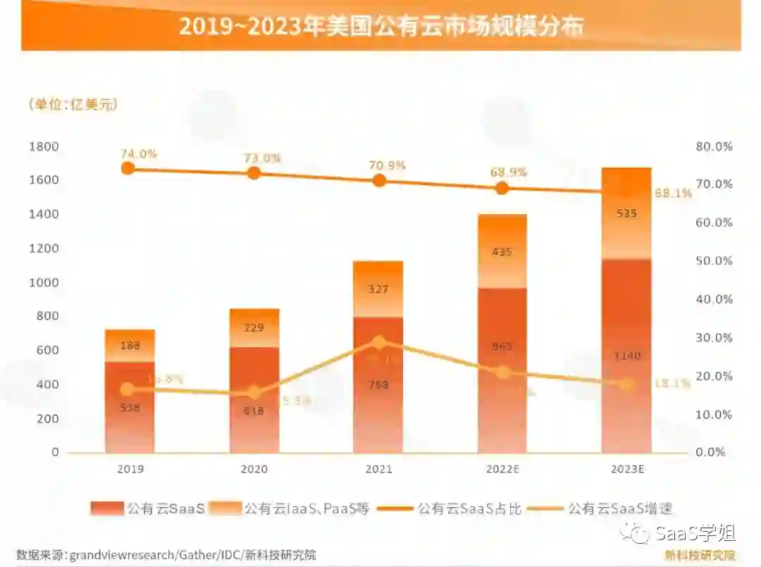 在美国,公有云SaaS占比,近几年的平均值是70%。