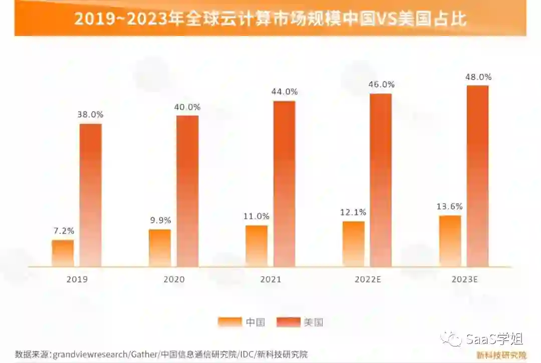 美国是全球云计算市场的领导者,市场规模占到全球整体超过四成,预计到 2023 年将拿下全球市场的半壁江山。