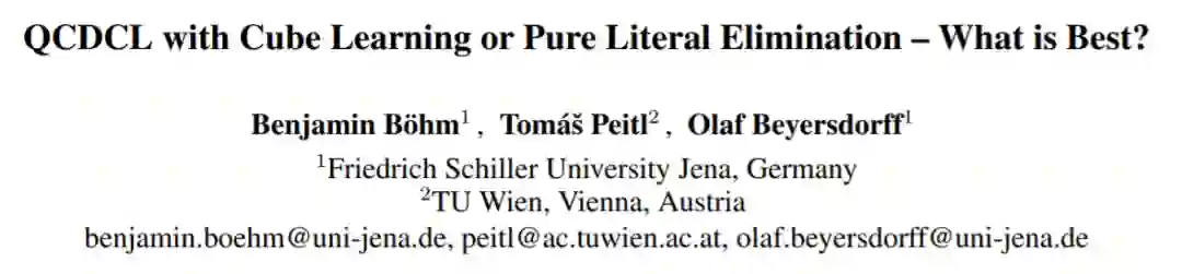 论文简介:在度量失真框架中,假设 n 个选民和 m 个候选人共同嵌入一个度量空间,这样选民对离自己越近的候选人的排名就越高。投票规则旨在选出与选民总距离最小的候选人,只给出排名,而不是实际距离。因此,在最坏的情况下,每个确定性规则都会选择一个候选者,其总距离至少是最优规则的三倍,即失真至少为 3。 该研究的主要成果是一个极其简单的投票规则,称为 PLURALITYVETO,它同样实现了 3 的最优失真。每个候选人开始时的得分等于他的第一名投票数。之后分数通过 n 轮否决会下降,在这个过程中,当一个候选人的分数达到 0 时,他就会退出。选民逐个地降低他们在候选人中排名靠后的分数,最后一位候选人获胜。 论文 2:QCDCL with Cube Learning or Pure Literal Elimination - What is best?