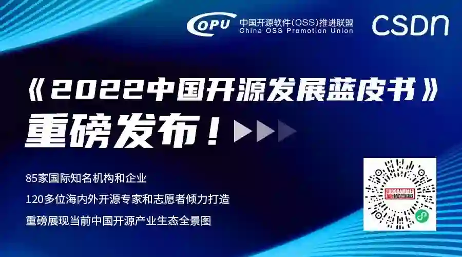 为完整呈现 2022 年中国开源产业生态全貌,在 2022 年 7 月 21 日由中国开源软件推进联盟(COPU)主办的 “2022(第17届)开源中国开源世界高峰论坛”中,《2022中国开源发展蓝皮书》重磅发布!