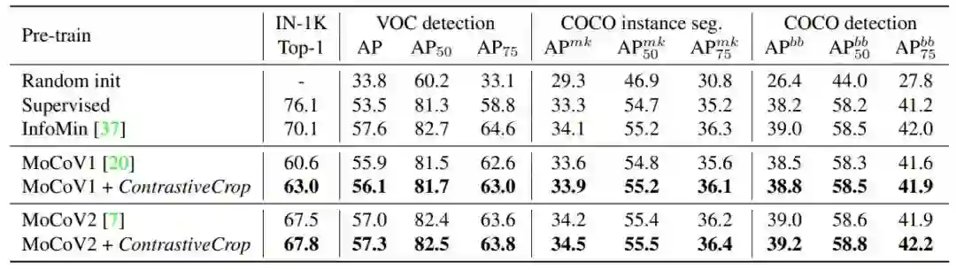 最后,在下游目标检测和实例分割任务上,ContrastiveCrop预训练模型的微调结果也一致好于RandomCrop。