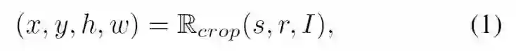 其中s代表了crop的大小(scale),r是crop的高宽比(aspect ratio),I是输入图片,Rcrop代表了随机裁剪函数,它返回一个四元组(x, y, h, w),分别定义了crop的中心坐标以及高宽。
