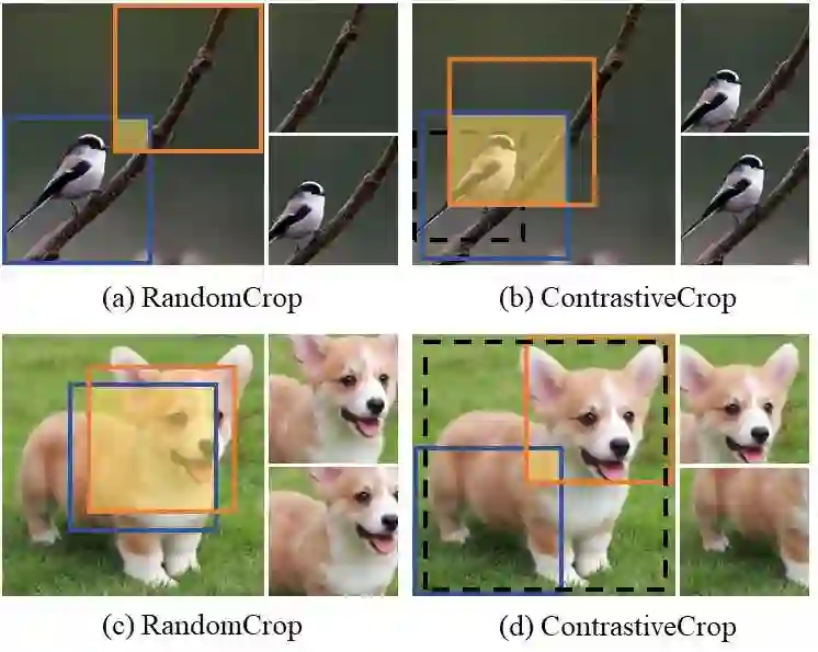 数据增强操作在对比学习中是至关重要的一个部分。以往对比学习的工作通常采用对于一张图片进行两次增强的操作,以获得同一图片的两个不同的景致(view)作为正样本对(positive pair)。尽管这些工作采用了更强的色彩增强方法(ColorJitter,GaussianBlur,GrayScale等),但是他们仍然采用随机裁剪(RandomCrop)这一监督学习中的传统裁剪策略。然而,在对比学习中,随机裁剪可能会生成错误的正样本对(如上图(a),物体对比背景),导致损害表征学习;或者有可能产生过于相似的正样本对(如上图(c)),对导致无效的优化目标。