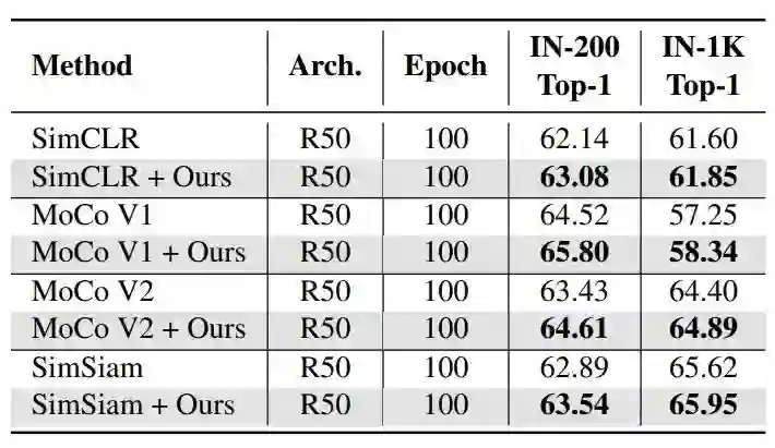表2展示了在ImageNet随机200类(IN-200)以及整个1000类(IN-1K)上的线性分类准确率。ContrastiveCrop的结果仍然全面高于使用RandomCrop的原始方法。