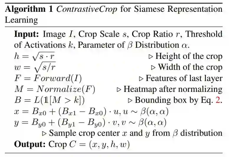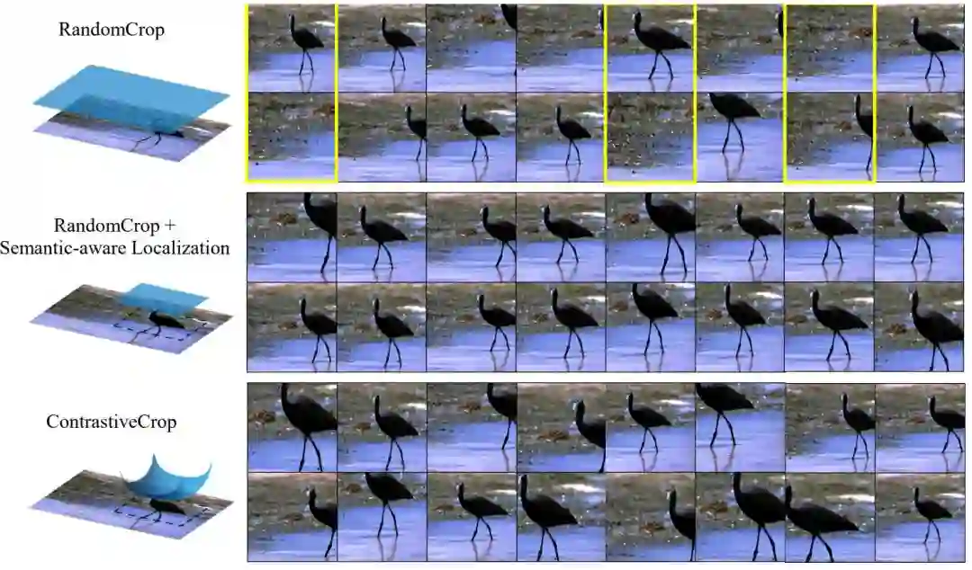 之前的工作已经指出,数据增强操作对于达到好的对比学习性能是至关重要的。然而,却鲜有工作考虑到样本对中两个图片块(crop)的选取。基于此,本文重新审视了传统使用的RandomCrop,指出了其在对比学习中的缺陷,并进一步为对比学习设计了新的裁剪策略,命名为“对比裁剪(ContrastiveCrop)”。ContrastiveCrop旨在确保大部分正样本对语义一致的前提下,加大样本之间的差异性,从而通过最小化对比损失学习到更泛化的特征。ContrastiveCrop完全即插即用,且理论上适用于任何孪生网络架构。广泛的实验表明,在几乎不增加训练内存和计算代价的前提下,ContrastiveCrop能够在若干常用数据集上稳定提升当前主流对比学习方法的性能。
