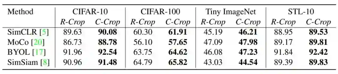 表1对比了RandomCrop (R-Crop)和ContrastiveCrop (C-Crop)在一些小规模数据集上的线性分类表现。对于不同数据集和不同对比学习方法,ContrastiveCrop稳定比RandomCrop高了0.4%~2.0%分类准确率。